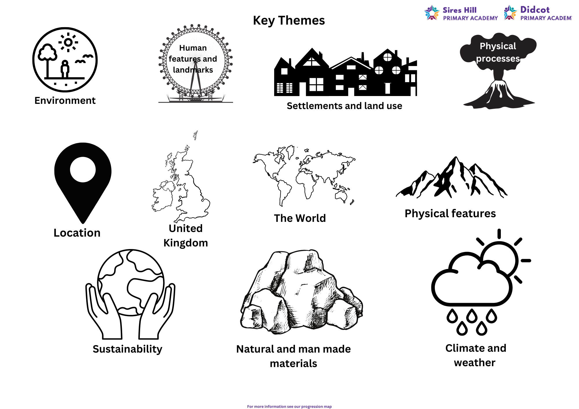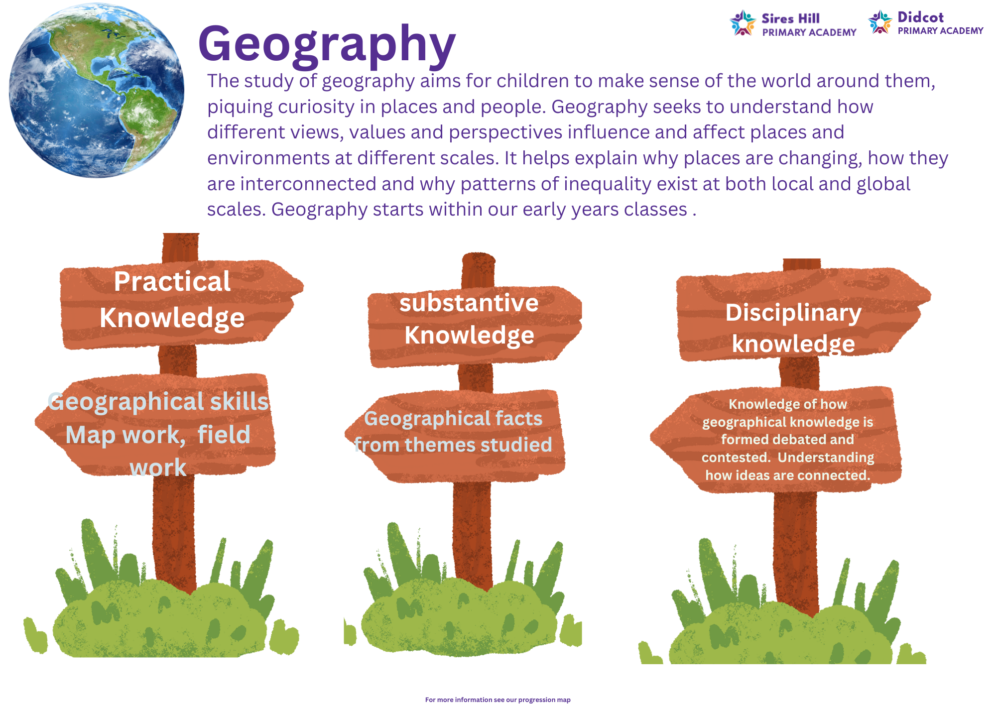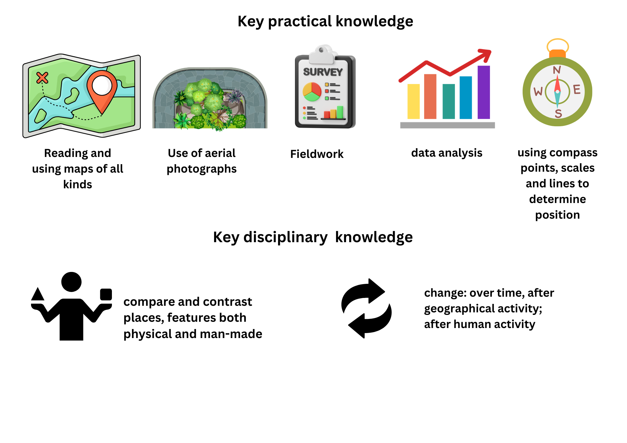 Further develop positional language Field work. Use photos to see how school has changed over time. Collect data and create maps. Build knowledge of world wide locations. Locate seas and oceans.