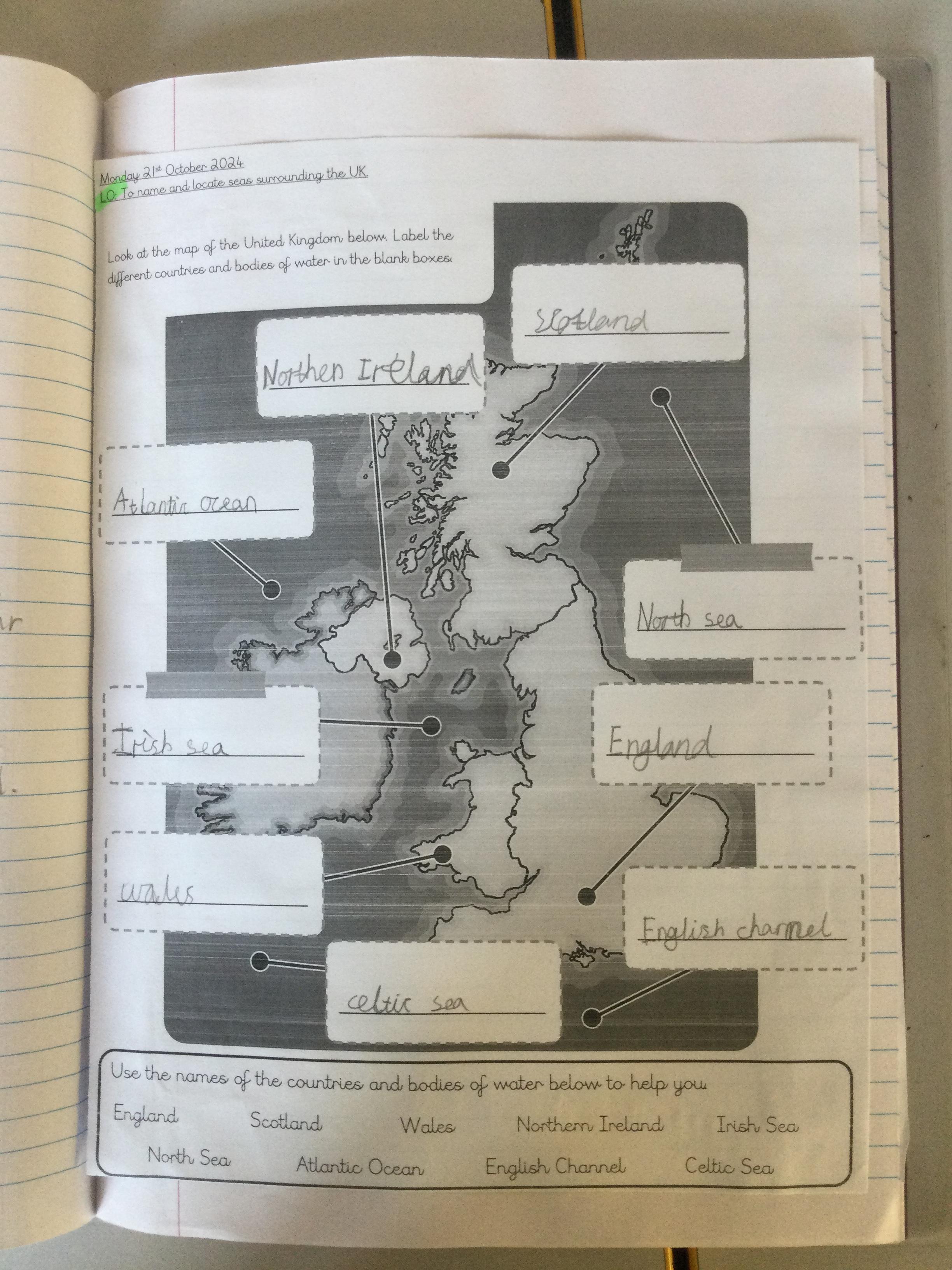 Year 2 Use an atlas and read world maps.  Revisit cardinal compass points.  Use a key with maps. Collect and interpret data. Learn more about the four countries of the UK and compare England to Somalia. Revisit map of UK, seas and oceans.  Revisit using keys. Physical and human features of coastal regions across the UK.