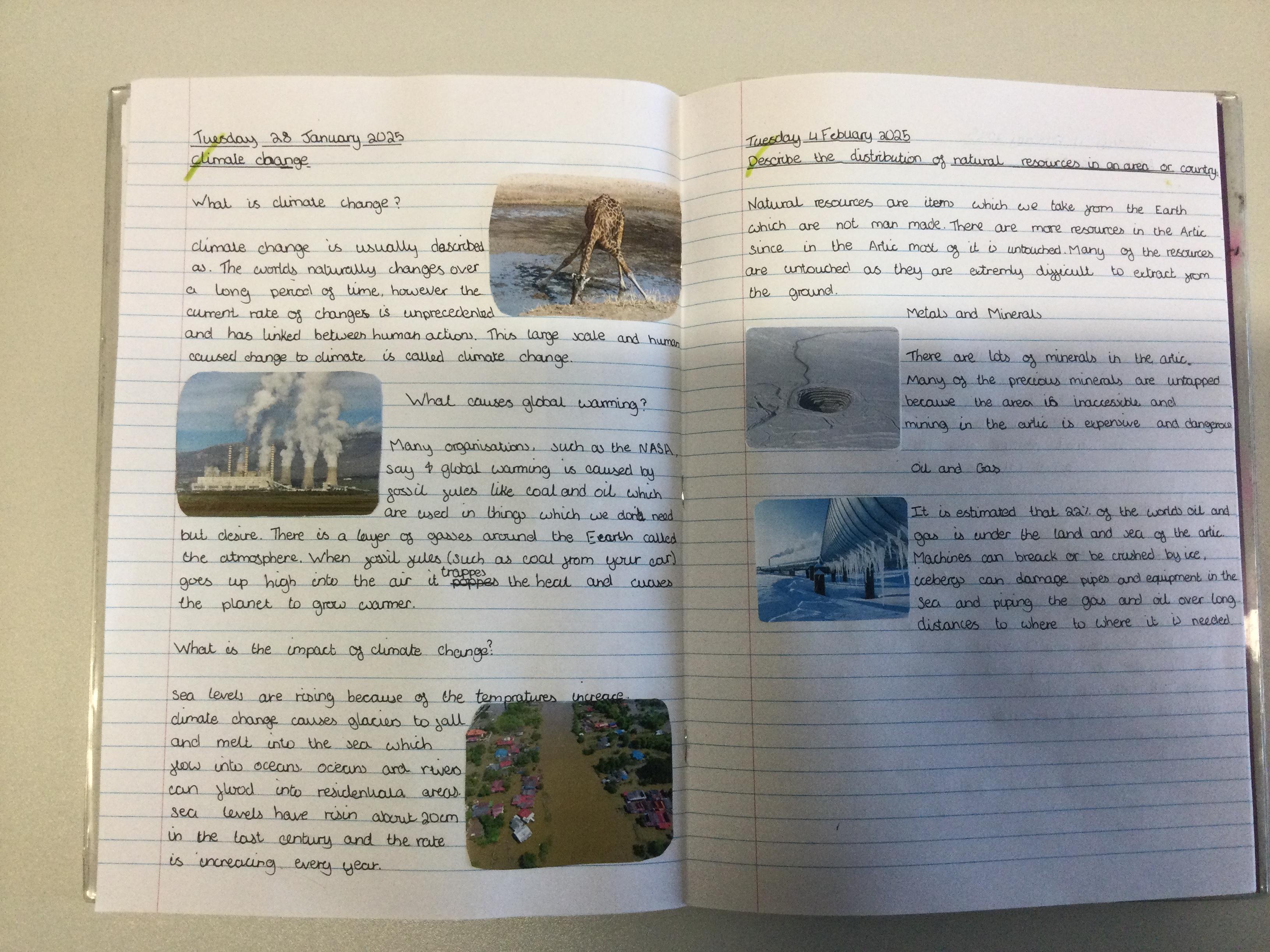 In Year 6, the children learn about daylight hours with a focus on the Artic. They will further their understanding of physical features and continue to learn about the challenges presented by climate change. In addition, the children will continue to broaden their knowledge and understanding of people and communities around the world. Finally, they will look for, and identify , geographical patterns on a range of scales applying all their knowledge and skills that they have developed throughout their primary school career.