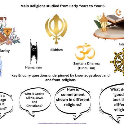 | Year 6 | How is the Qur'an vital to Muslims today? | Do Christian celebrations and traditions help Christians understand who Jesus was and why he was born? | Is anything really eternal? | Is Christianity still a strong religion over 2000 years since Jesus was on Earth? | How do inspirational people impact on how Humanists live today? | Does belief in Akhirah help Muslims live a good life? |